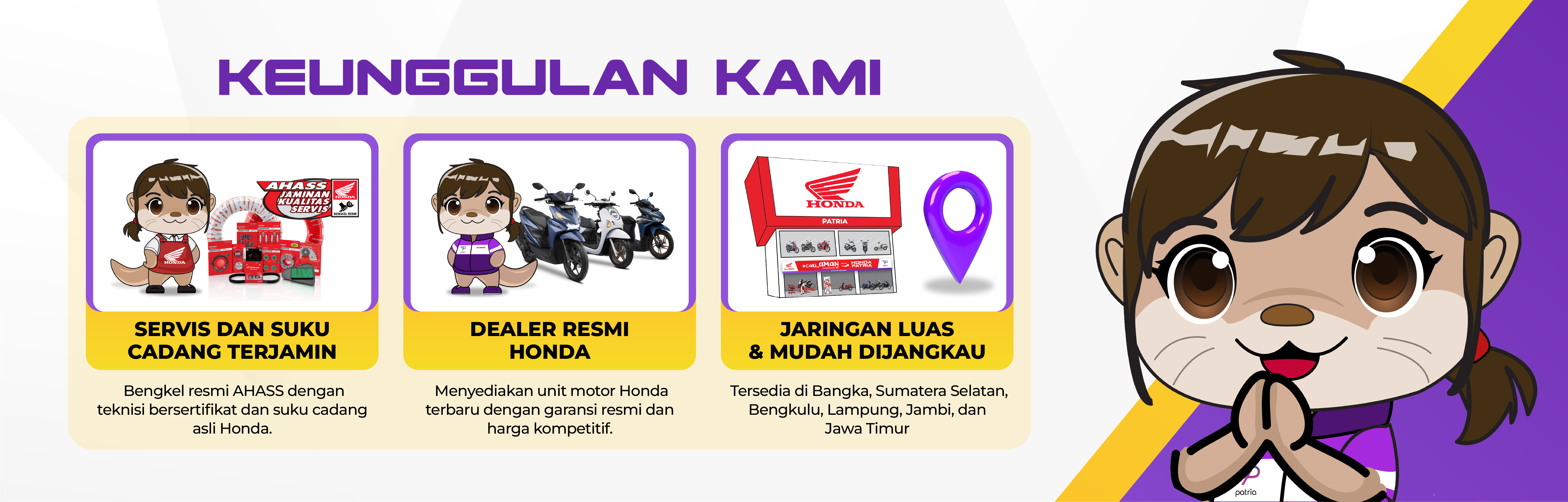 PT Patria Anugrah Sentosa adalah grup dealer resmi sepeda motor Honda yang telah melayani pelanggan sejak tahun 1995. Dengan lebih dari 15 cabang yang tersebar di Sumatera hingga Jawa Timur, kami berkomitmen untuk memberikan pengalaman berkendara yang aman, nyaman, dan memuaskan.
